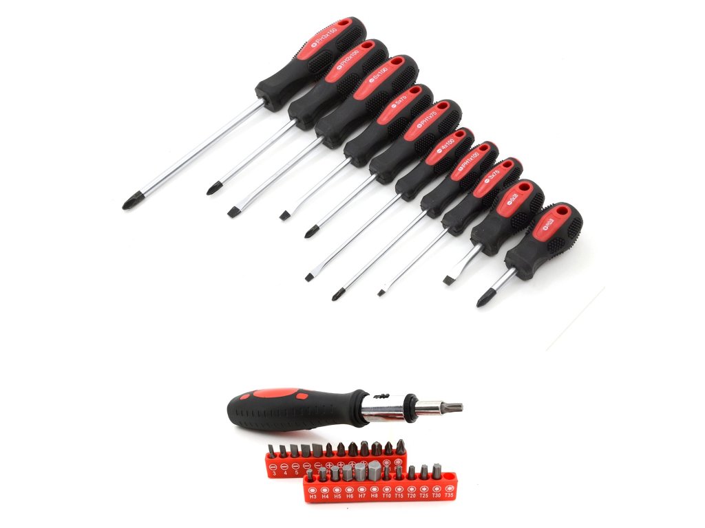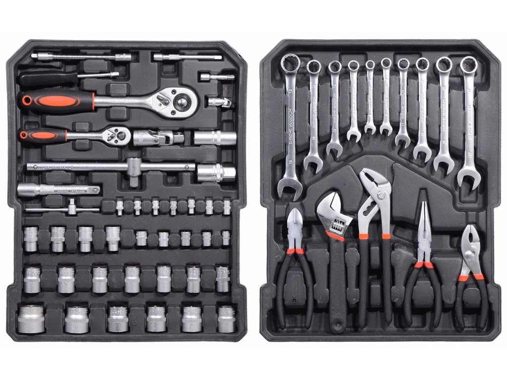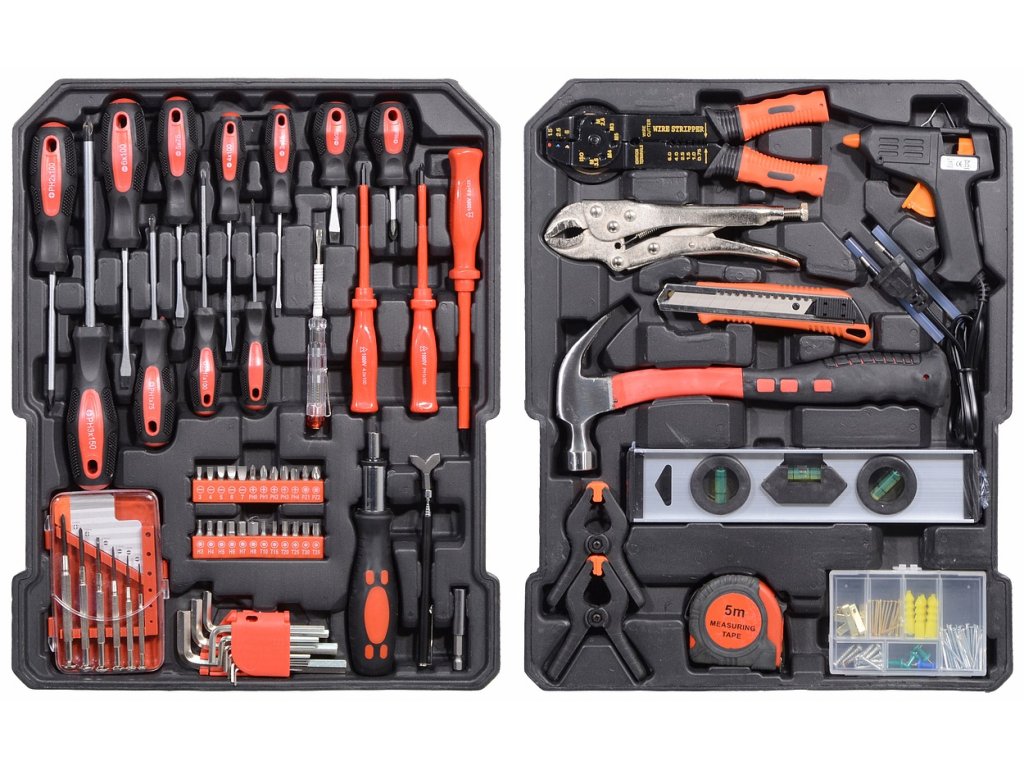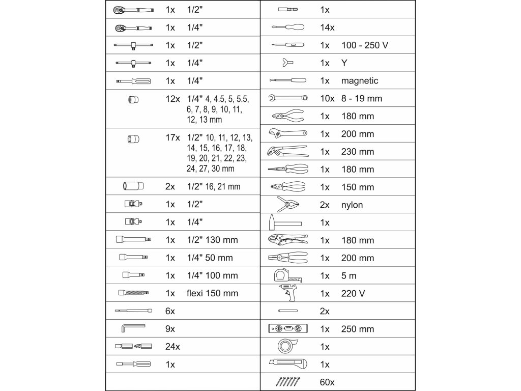 Sada obsahuje celou řadu kleští, šroubováků, gola klíčů, kladivo, vodováhu, stranové i imbus klíče, bity, základní spojovací materiál a celou řadu dalšího nářadí, které je vhodné pro použití jak doma, v garáži, tak i na cestách.